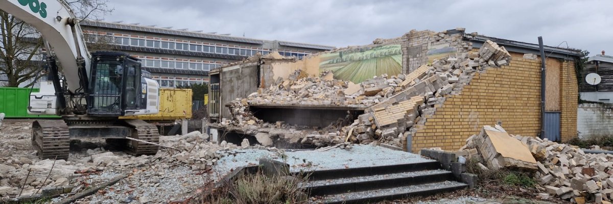 Nachdem bis Anfang Januar die Entkernung im Inneren der Mehrzweckhalle sowie der WC- und Kelleranlagen stattgefunden hat, erfolgt nunmehr seit dem 10.01.2024 der eigentliche Abbruch von Dächern, Wänden, Decken und der Kelleranlagen – deutlich für jedermann sichtbar.